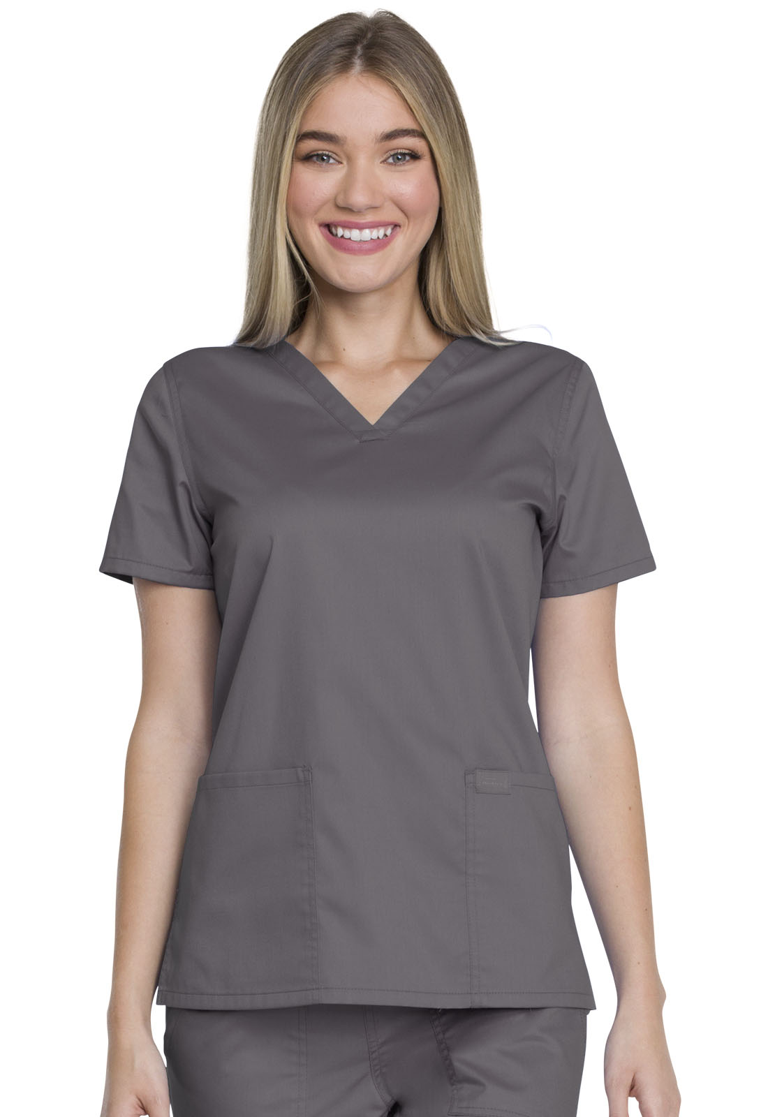 This V-neck top features two patch pockets, and side vents for comfort and