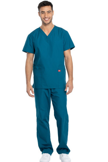A must-have unisex set from the famous Dickies brand. A mini price for the top and bottom! Straight cut. V-neck with 2 pockets at the bottom. Drawstring pants feature a back pocket for your storage needs. Comfortable fabric suitable for your job.
