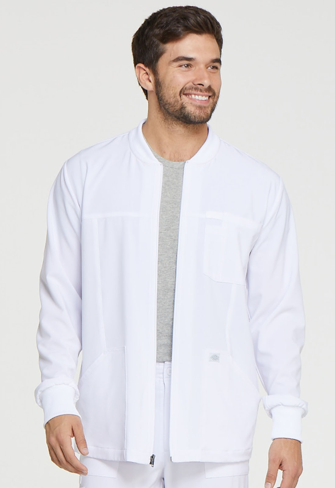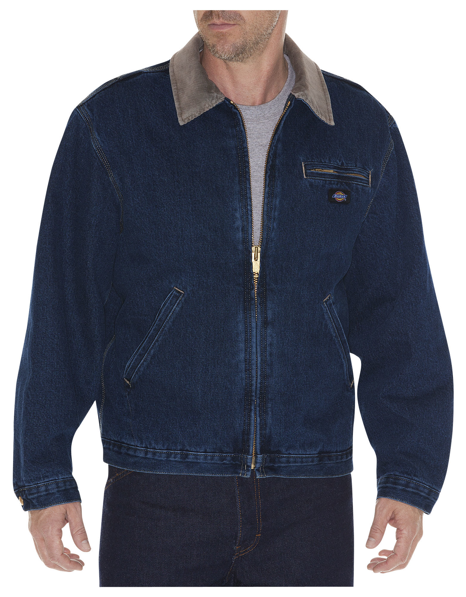 A Mens zip front jacket features two patch pockets, one chest pocket with a pencil stitch, rib knit cuff and neckband and a Dickies tonal woven label. Center back length: 29""