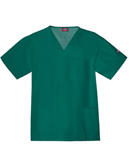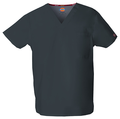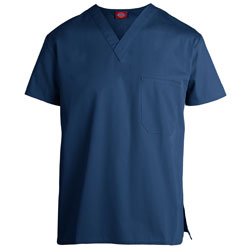 Dickies Uniforms offers this scrub top for men. It is designed with short set-in sleeves and features back pleats and side vents for added comfort and ease of movement. Multiple pockets are added including a chest pocket, sleeve pocket, two roomy lower pockets with pen pocket on the left, which are all useful for storing your important tools and other personal items. It has a Velcro closure on the patch pocket to keep items secure. A locker loop on the back yoke is also added. The center back length is 29 inches and the fabric is made of polyester/cotton and poplin.