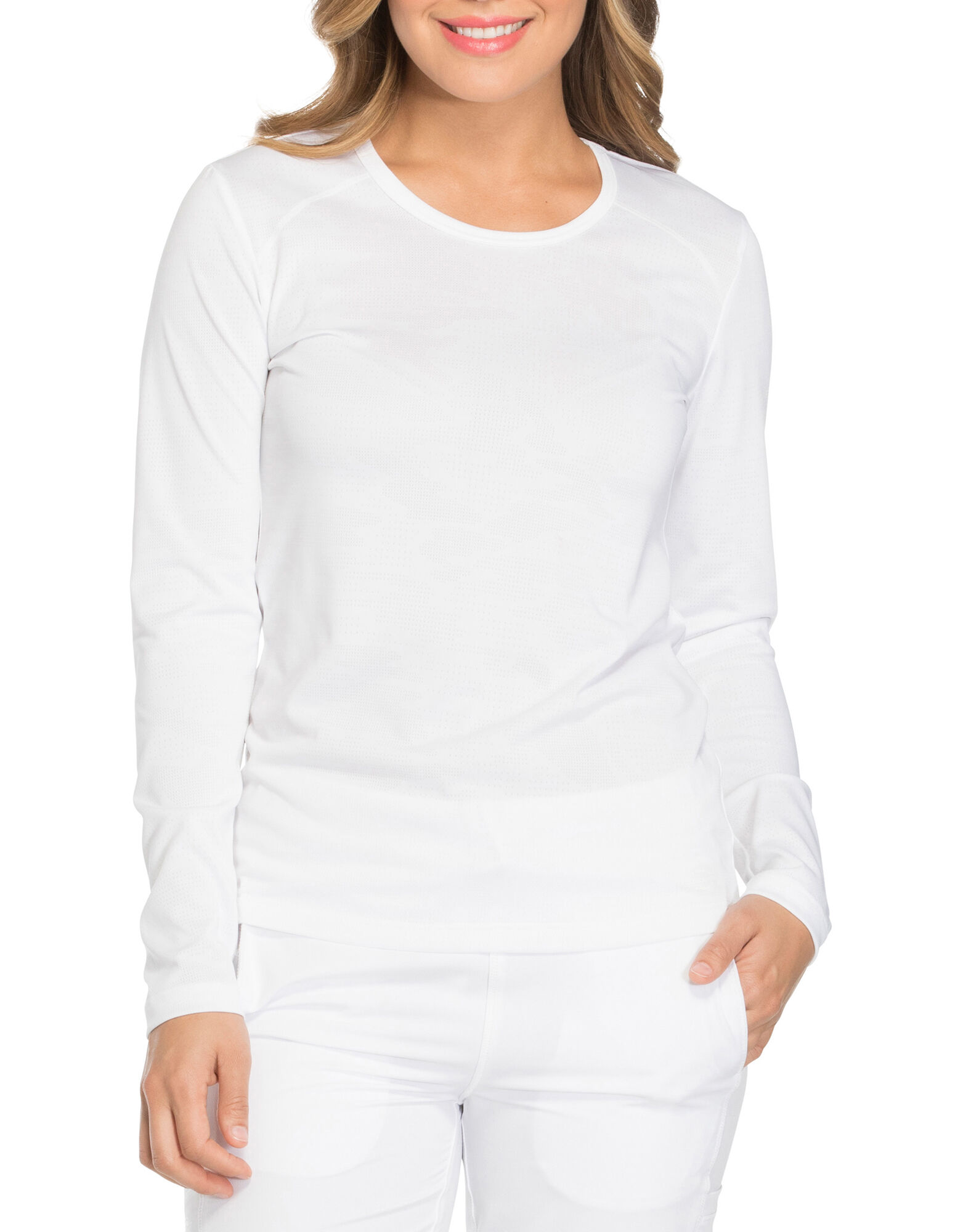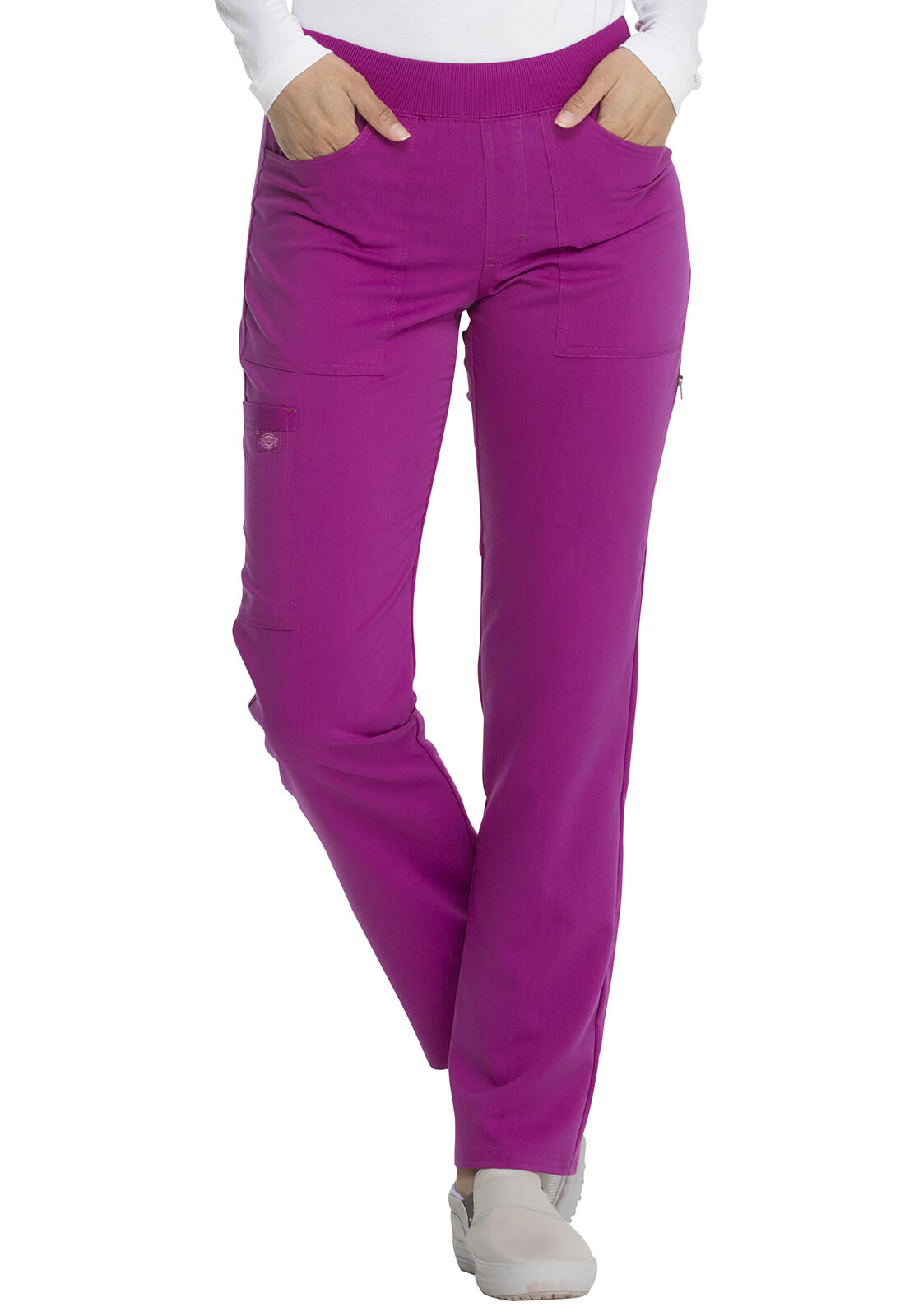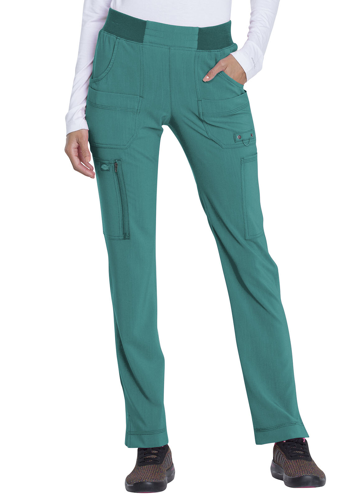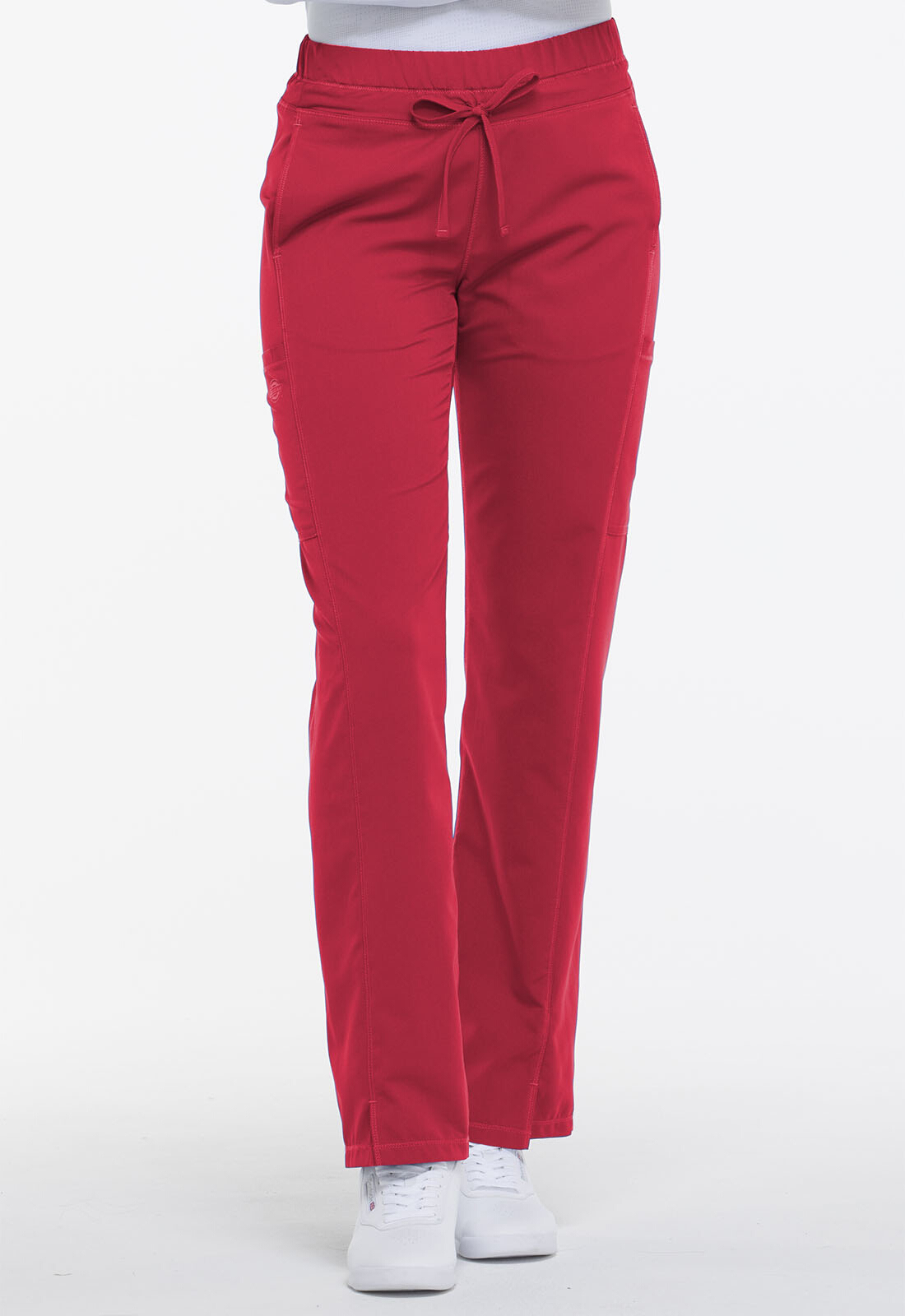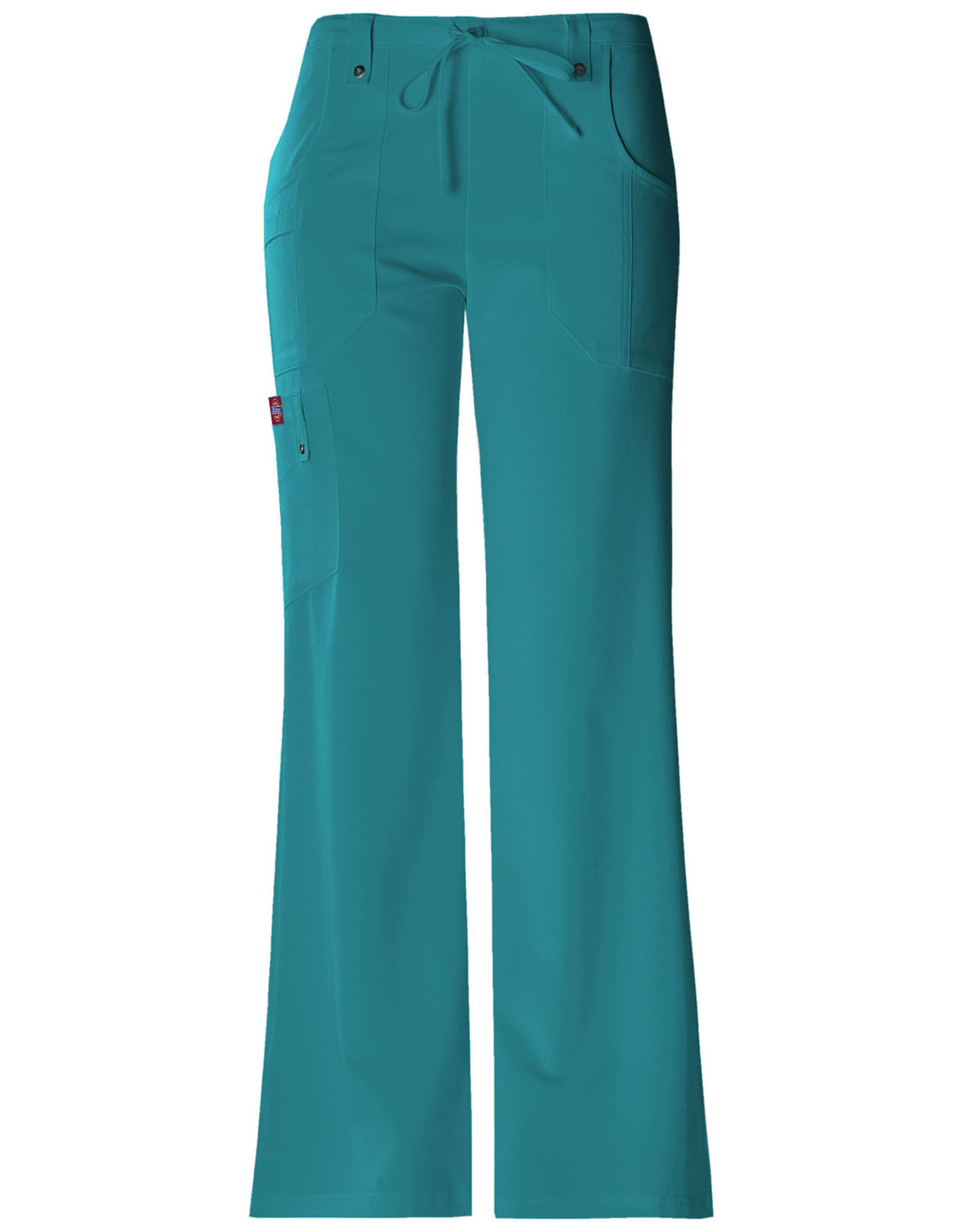 Dickies Women's Dynamix Mid Rise Straight Leg Drawstring Pants are a mid-rise pant designed with a straight leg for a contemporary fit. You’ll go patient to patient in comfort with the elastic waistband and drawstring waist—designed to create the perfect fit. Several pockets, including a cargo pocket, create plenty of room for tools or necessities you need to keep at your fingertips. Side panels and side vents help create movement and airflow throughout the pants.