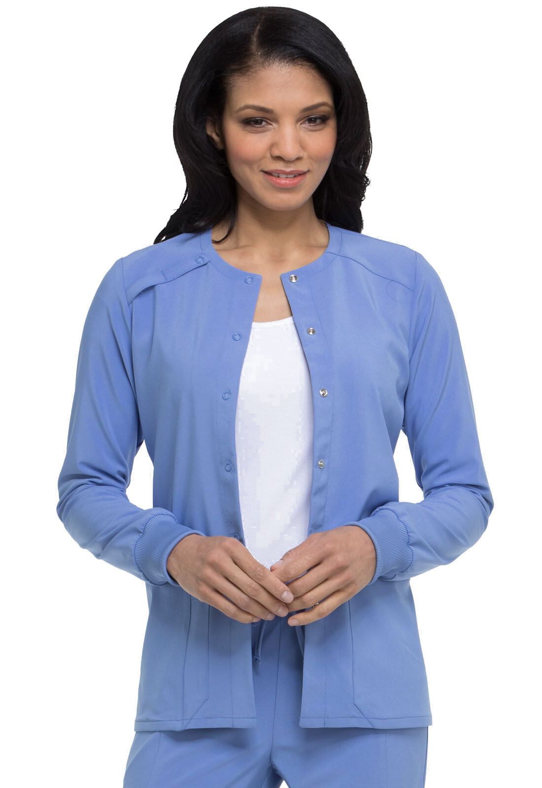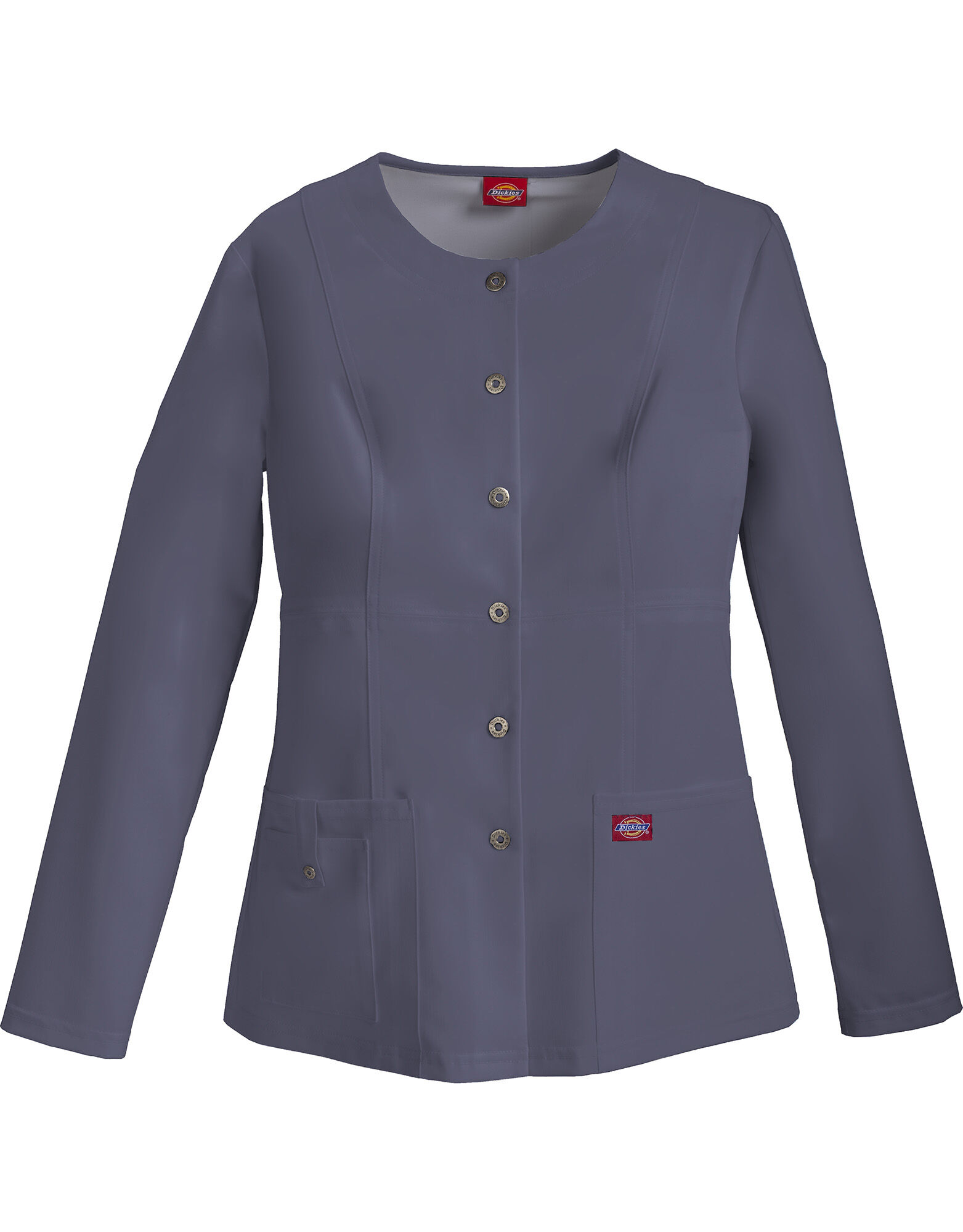 Rely on Dickies’ Snap Front Warm-Up Scrub Jacket to keep you comfortable at work. The contemporary fit combines with enough spandex to keep it fitted and comfortable all day. Front and back princess seams conform this warm-up jacket to your body to flatter every minute you wear it. The front patch packets and cell phone pocket offer you some utility to carry necessities, while the button front lets you control your level of warmth.