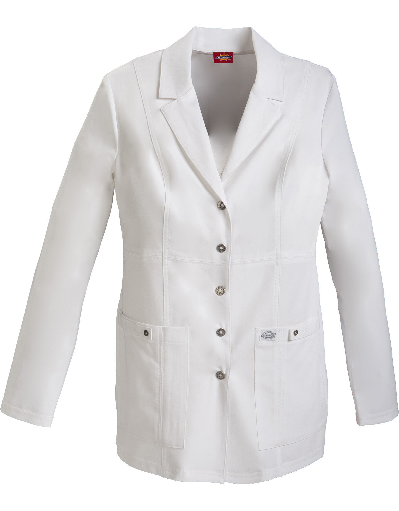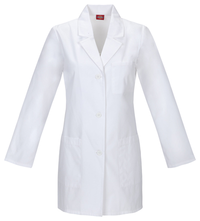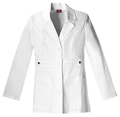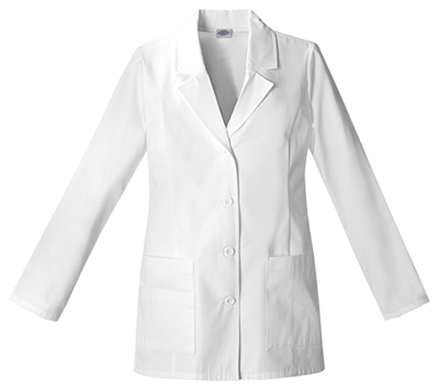 Our Womens contemporary fit, notched lapel lab coat features front and back princess seams, patch pockets with snap tab detail and back belt tabs. Center back length: 28". Great for many medical professions.