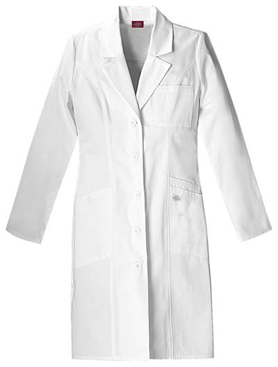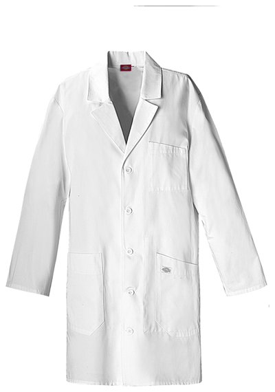 Unisex lab coat features a notched lapel and a four button front closure. Also featured are one chest pocket with a pen and instrument slot and two lower patch pockets with side entry for easy access to pant pockets. Back waist belt and back kick pleat complete this coat. Center back length: 37".