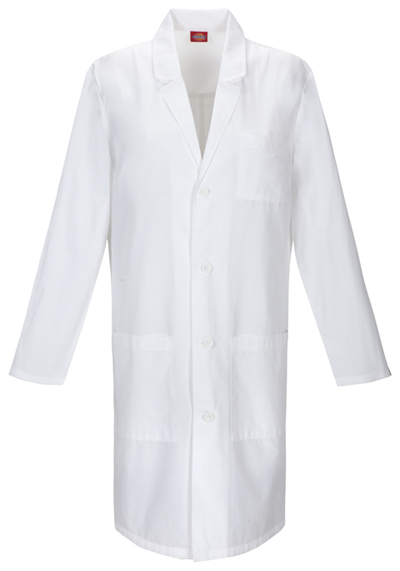 Unisex Fit lab coat features a notched lapel and a four button front closure. Also featured are one chest pocket and two lower patch pockets with side entry for easy access to pant pockets. A back yoke and kick pleat complete this coat. Center back length: 40".