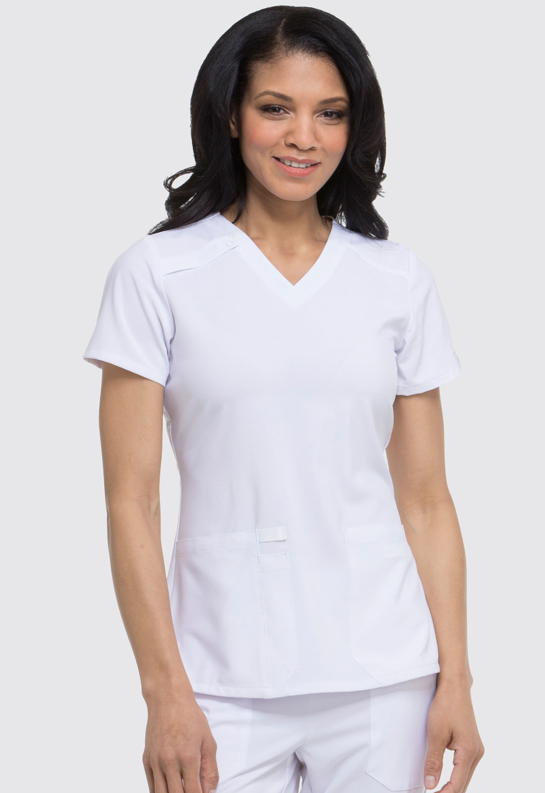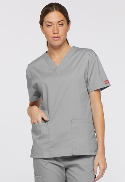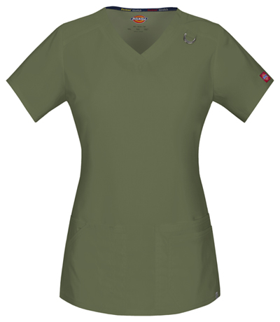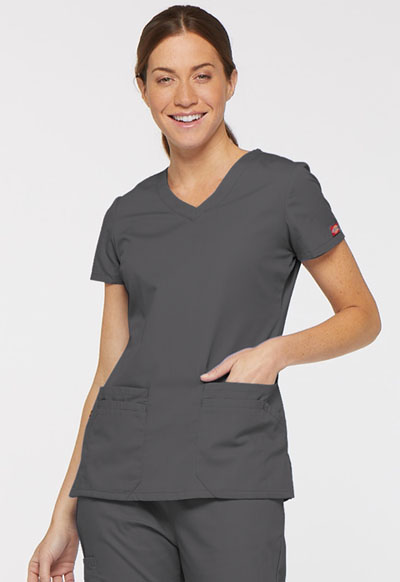 A Contemporary fit V-neck top features Dickies logo twill tape at the back neck and has an instrument loop inside the wearer’s left patch pocket. Also featured are a front yoke with a Dickies logo D-ring on the left yoke seam and four front pockets with a pencil slot on top of the right pocket. Back princess seams and side vents complete the look. Center back length: 26"