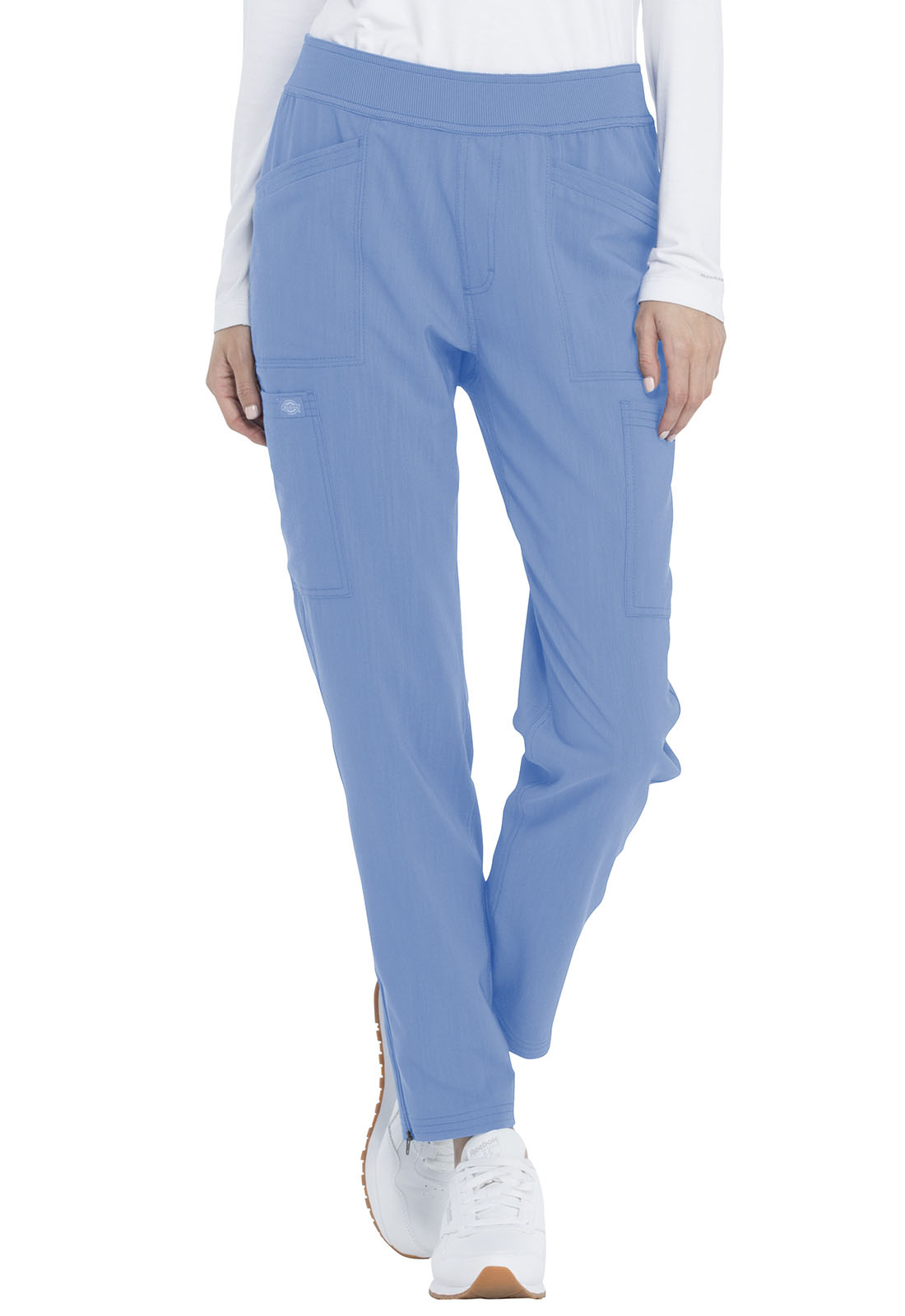 This flattering and functional midrise pull-on pant features a skinny leg, pop tonal thread color throughout, and a rib knit waistband with encased elastic. It has numerous pockets for all your storage needs, including two front pockets, two cargo pockets, and two back pockets. Dickies tonal label, and side vents with functional zippers for easy slip on. Contemporary fit.