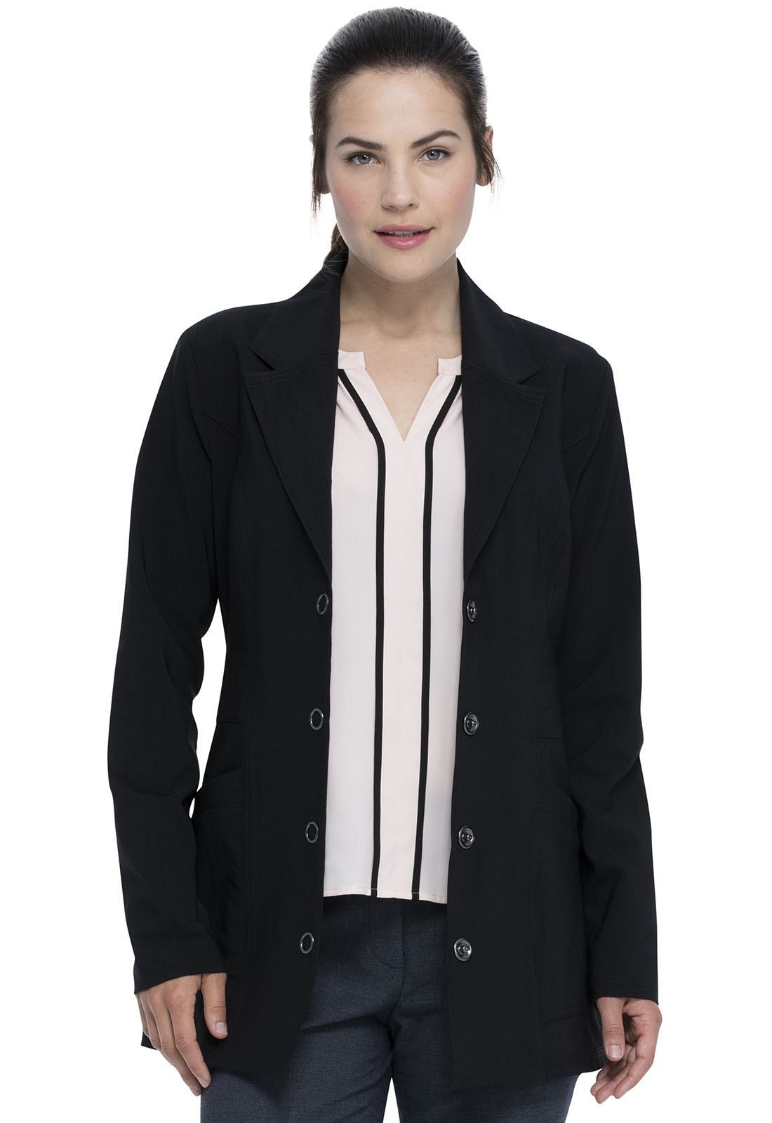 A Modern Classic fit 34" button front lab coat features a notched lapel, princess seams, side angled pockets with an extra hidden functional pocket and elastic at the side waist for a slim look.