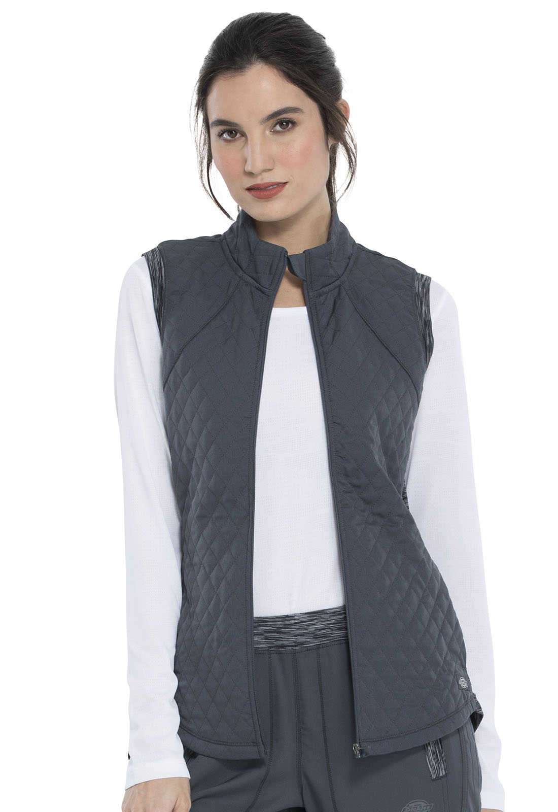 This contemporary fit quilted vest features a full zip, side entry pockets, space-dye knit side panels and a signature tonal woven label with coverstitch detailing throughout.