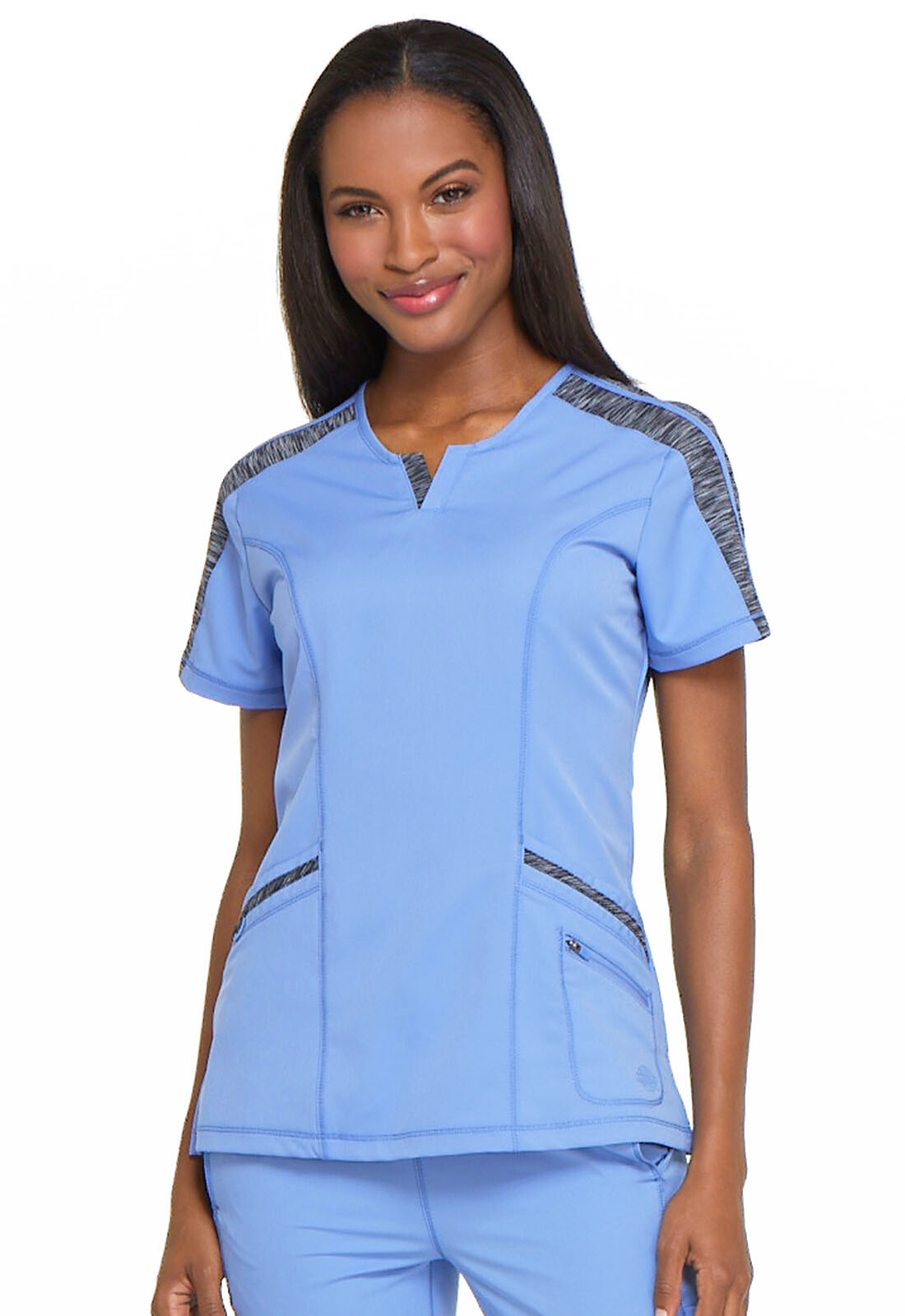 Working around the clock is possible with Dickies’ Contemporary Fit Xtreme Stretch V-Neck Scrub Top. It featues a stretchy fabric that keeps you comfortable. Designed to fit close to the body, we rely on the princess seams in the back to supplement the shape. Two front vents create a breathable scrub top while the decorative eyelets add some serious style.