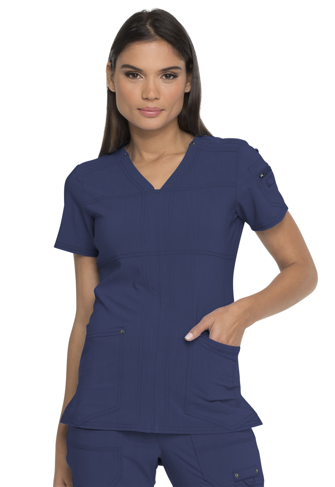 A Contemporary fit, V-neck top features Dickies logo twill tape at the back neck and has an instrument loop on the right pocket. Also featured are multiple patch pockets with pencil slots, back princess seams and side vents. Center back length: 26"\