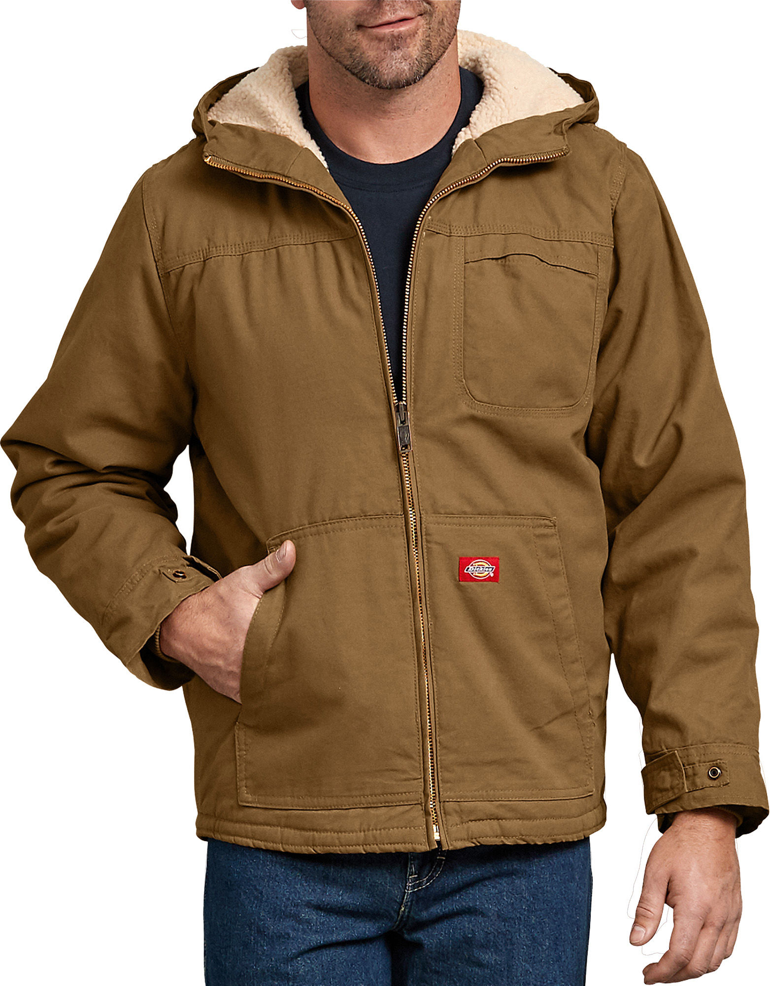 Our contemporary fit zip front jacket features two welt pockets with decorative top stitching and shoulder yokes. Perfectly located at the neck we offer a rib knit collar, rib knit cuffs and rib knit waistband for needed comfort and sleeve strapping for added fashion. Dickies tonal woven label.