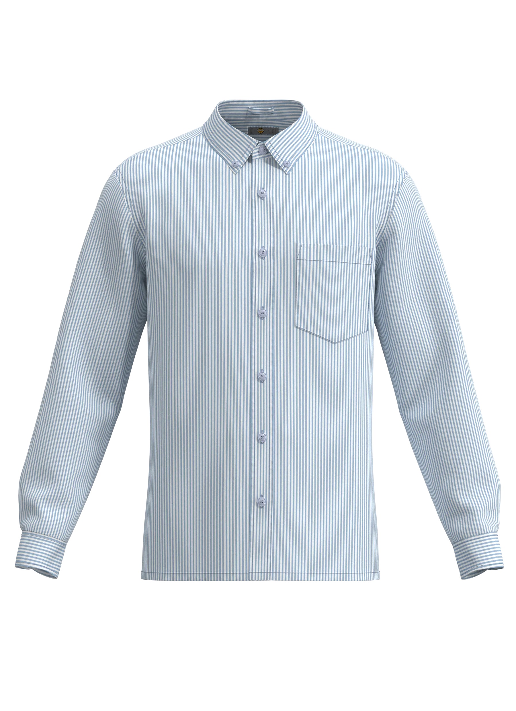 Long Sleeve. Button down collar. Placket front with seven buttons and left chest pocket. Longer tails and a box pleat in back. (4 1/4 oz. Yarn Dyed Oxford)